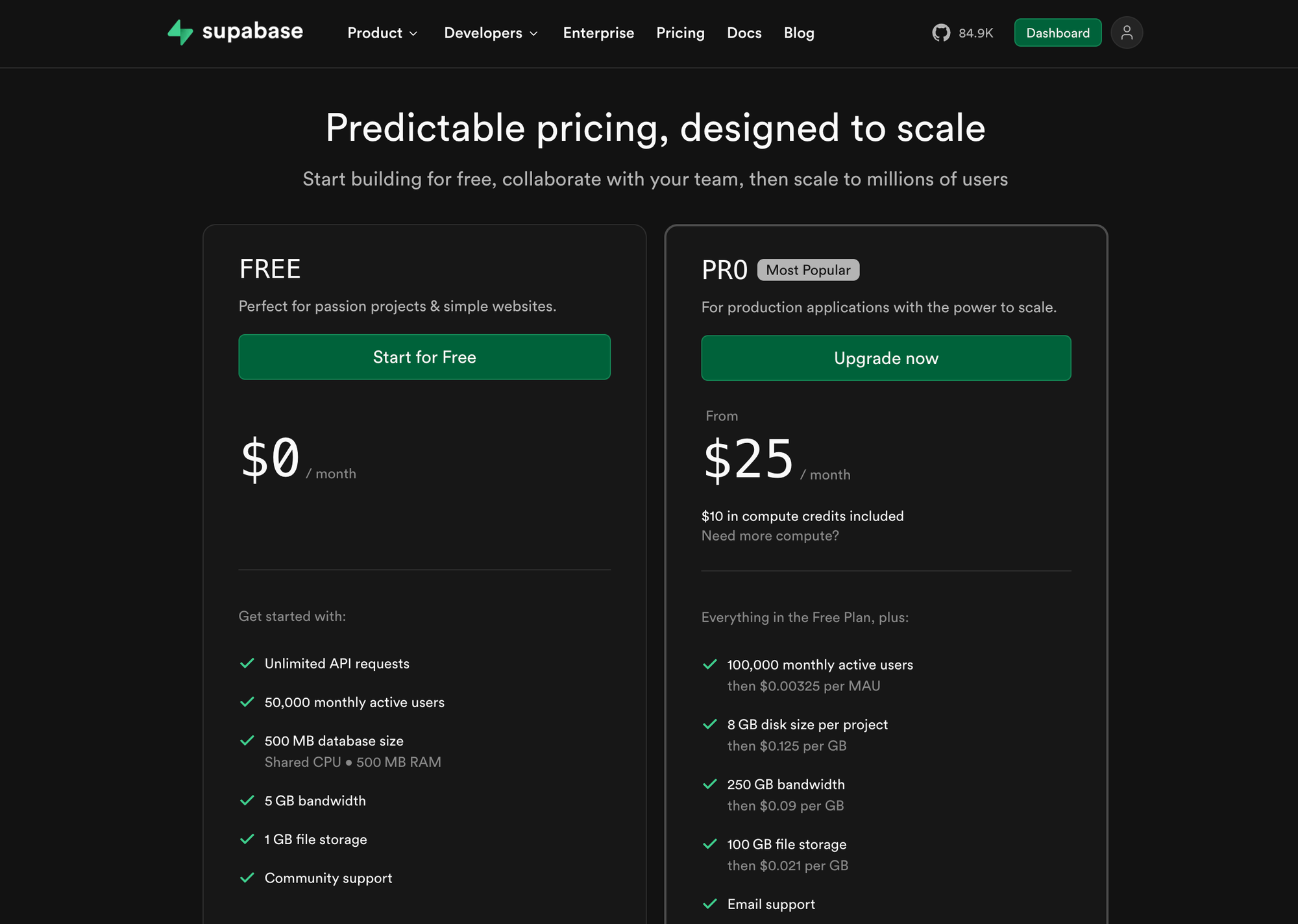 - Supabase: Employs a tiered pricing model based on data storage, offering unlimited API requests and authentication users, resulting in more predictable costs.